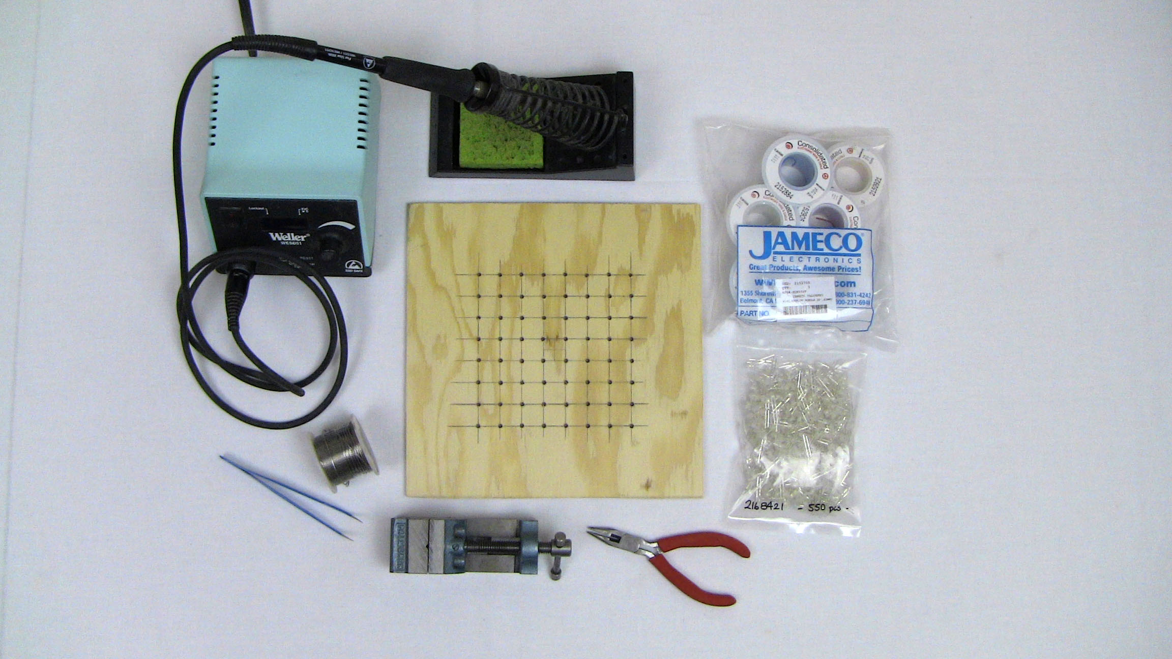 To build each horizontal layer of the 8x8x8 LED Cube you will need a few tools: A soldering iron, tweezers, a vise, pliers, wire, LEDs and the wood template we made. You can see them pictured below: