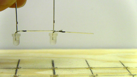 ·Then, place another LED in the next spot and bend both of their cathode pins so that they are perfectly straight. At that point, solder the two pins together.