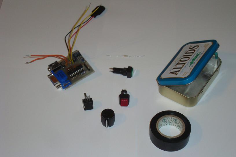 ·So gather the remaining parts: 560 Resistor, mint box, buttons, led, knob and electrical tape.