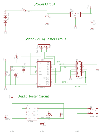 The Mini AV Test Box circuit is as simple and straight forward as I could design. It has three main sections that I split up in the schematic. The main devices used in the circuit are the 7805 +5v Regulator, 16F84A Microcontroller and 555 Timer.
