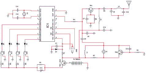 The crystal labeled X1 is actually a 27MHz oscillator. This will generate the frequency signal that the IC1 output will be modulated to (Toy RC cars are allowed to be on either 27MHz or 49 MHz frequency channels). The signal mixing occurs directly after the R4 Resistor approaching the output transistor (TR1). Output finally occurs after all that and is relatively low power (mW range). Understanding this circuit is not crucial to creating this project.