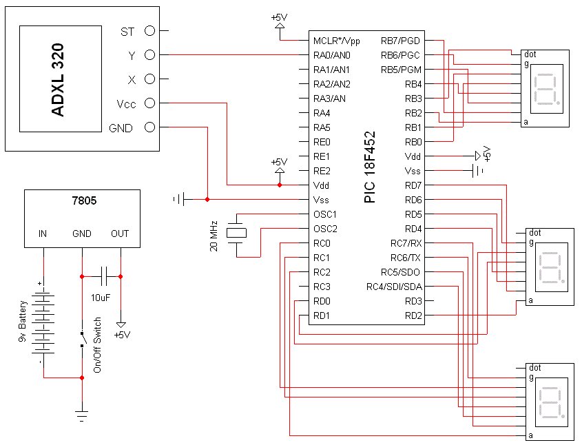 The Schematic has three main parts to it. The Sensor Circuitry where the accelerometer is wired up to the A/D converters. The second part is the power circuit where we have the On/Off switch, the 9v battery & +5v 7805 Voltage Regualtor. The 3rd part of the circuit is the 3 7-Segment LEDs.