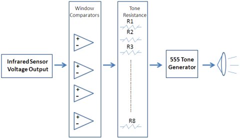First, the IR proximity sensor outputs a voltage, then the window comparators will compare that voltage to their constant upper and lower limit voltages (set using voltage dividers with 2 resistors). If the voltage output (by the IR proximity sensor) is inside of the two voltages or 'window', that comparator will output to a certain resistor which sets a specific tone for the 555 tone generator to output to the speaker. A little more than a mouthful, but I'll explain in more detail.