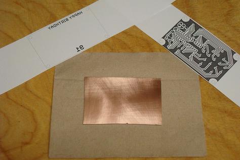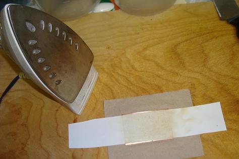 Using a hot iron, the top and bottom layers' toner is transferred by 'ironing' the design onto the copper on the PCB.