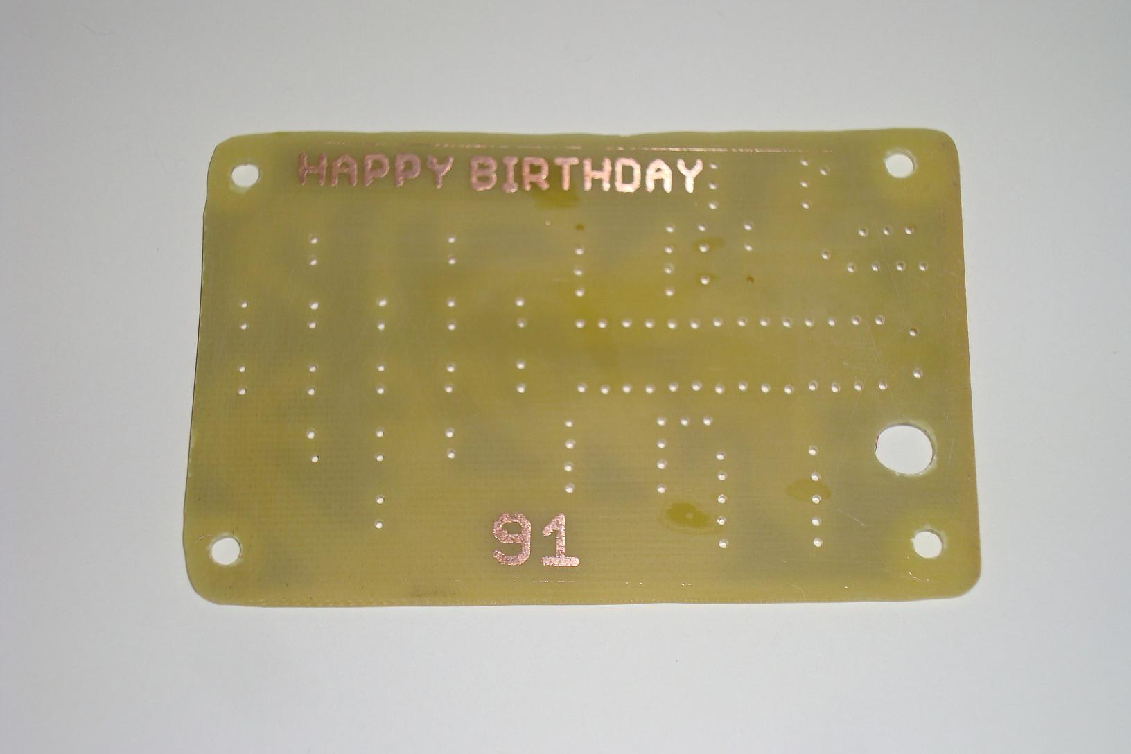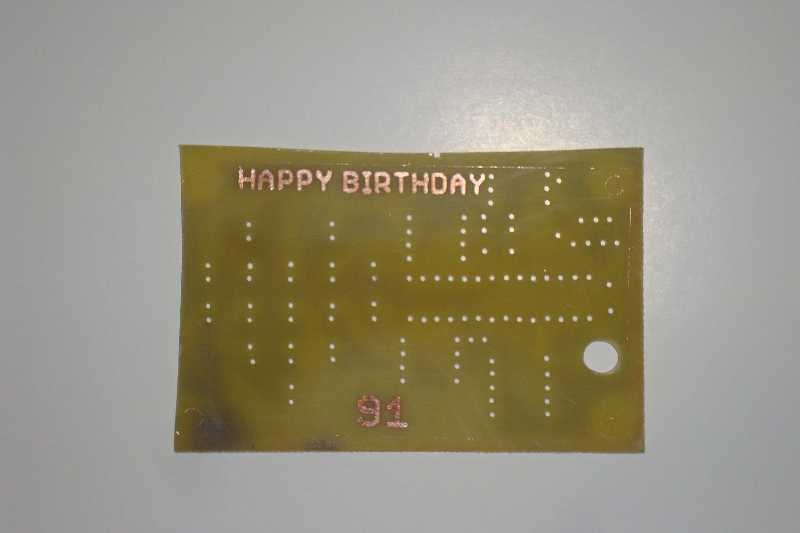 And the top side which will have most of it's copper etched away, leaving only the short message behind.