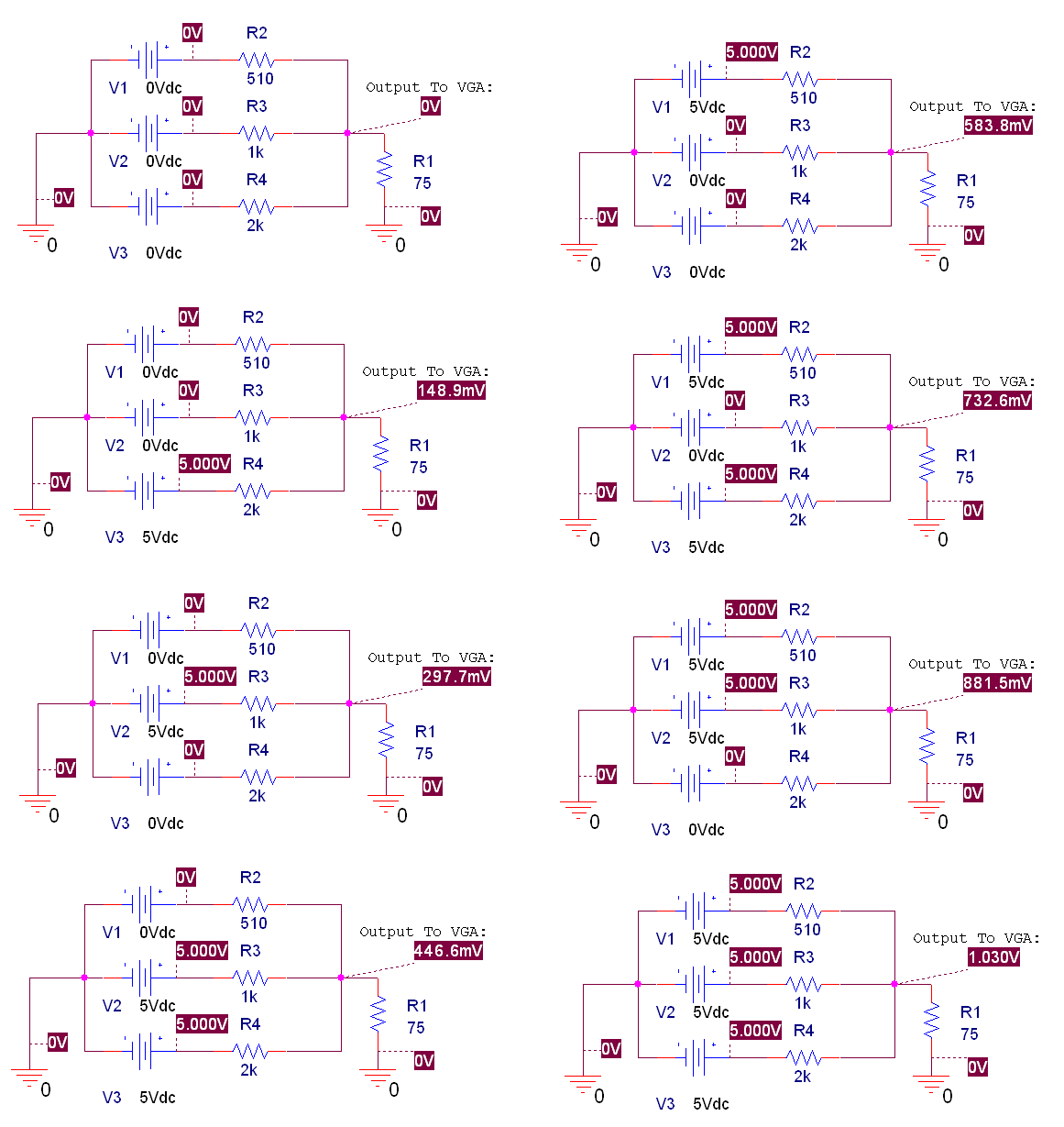 Each of these colors is output by either setting a single color line or by mixing Red/Green/Blue together to get the desired color, remember the color wheels from kindergarten? Well here's where it can come in handy for making VGA display certain colors.