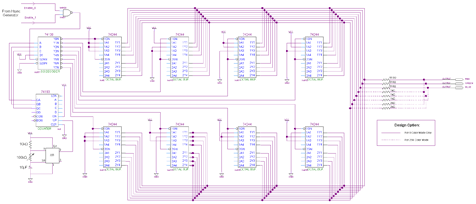 The last part of the schematic is the color generator. A state machine with 8 states is used to output 8 different color signals to the monitor. The design offers up to 256 unique colors to be output, however I only actually wired up enough for 8 unique colors. See the 'dashed lines' in the schematic for how to make 256 color work.