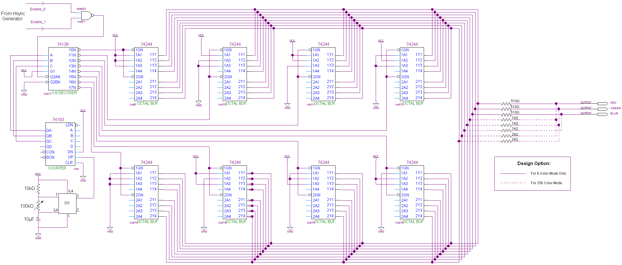 8 of these Octable Buffers are used to output different state values. When the 74-138 selects one of the 74-244 buffers, it activates and outputs its hard-wired value to the Red/Green/Blue pins of the VGA connector.