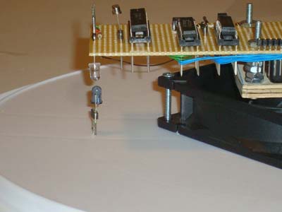 The picture seen above shows you where the 'home' location actually is on the pyro propeller clock pov. Whenever the propeller passes over the IR emitter, the phototransistor is turned on, connecting the 'collector' +5v pin to the 'emitter' ground. The PIC sees this 'falling' edge transition and knows that home was just reached.