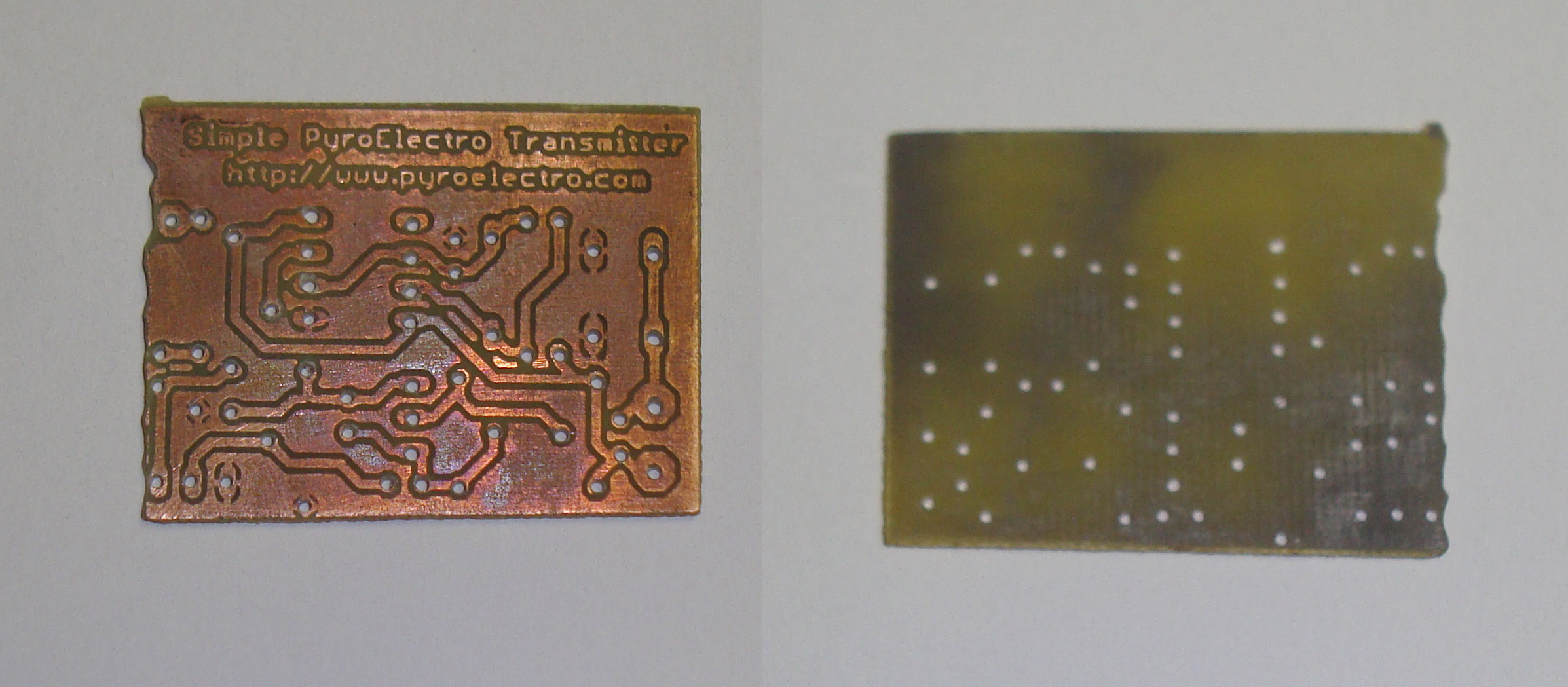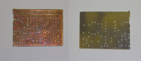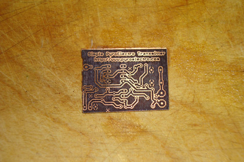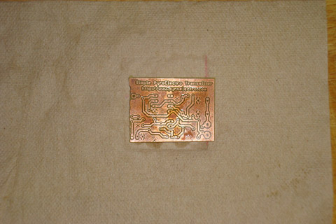 ·Next, the PCB was soaked in a bucked of ferric chloride, removing the excess copper.