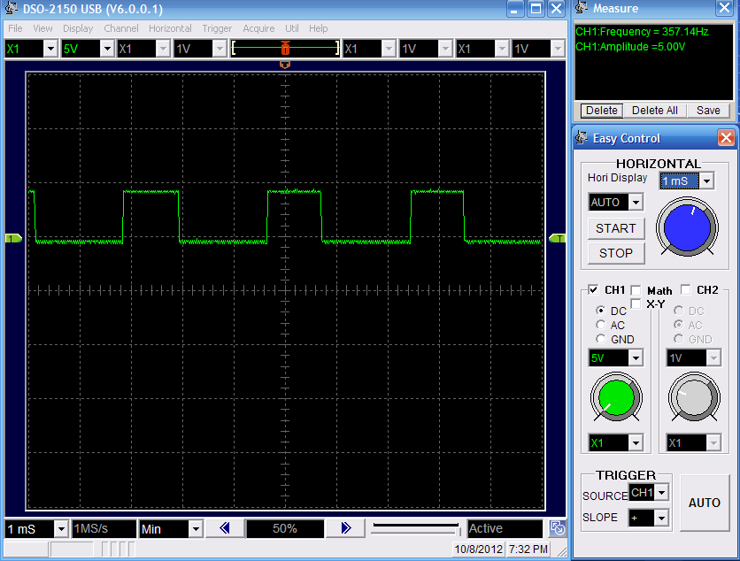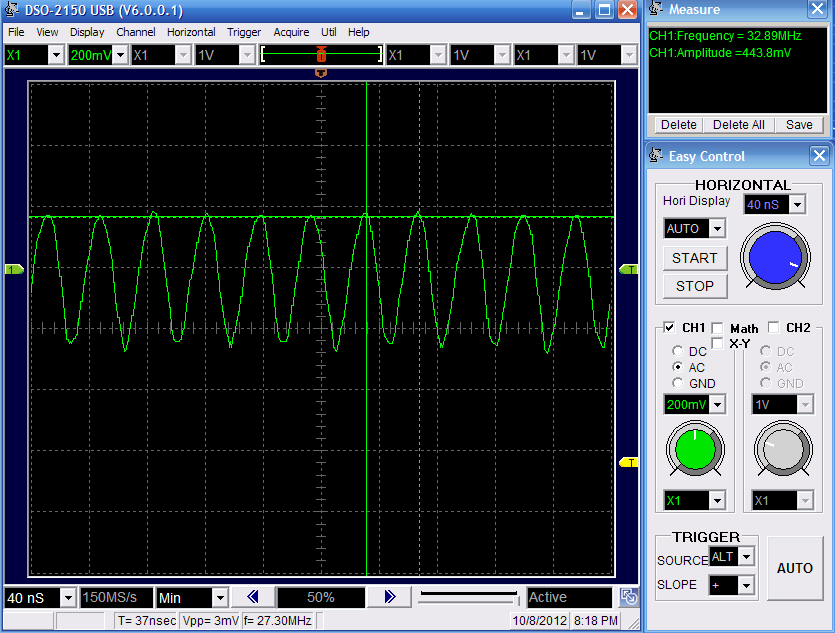 Above you can see that the circuit outputs a sin-wave at the frequency we're looking for. Because there is no filtering many harmonic frequencies are present that skew our results slightly, but this signal will work.