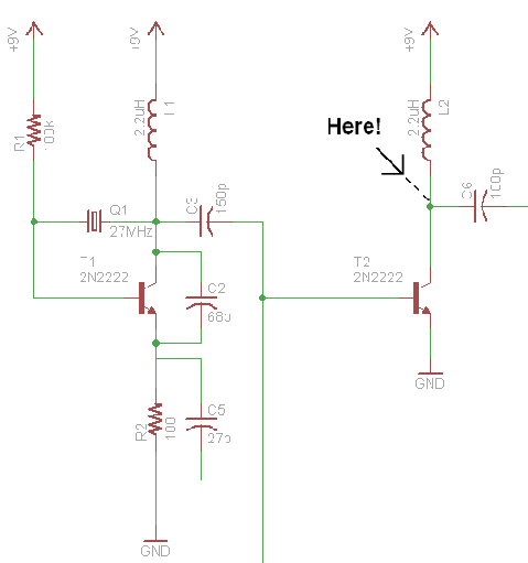 After the carrier 27.145 MHz goes out of the 150pF capacitor it meets with the 555 timer's square wave after the 22k resistors and these two signals mix together (multiply if you prefer). Below you can see the end result of this mixing and where exactly in the schematic it occurs: