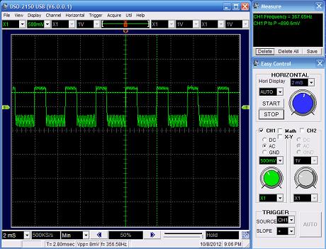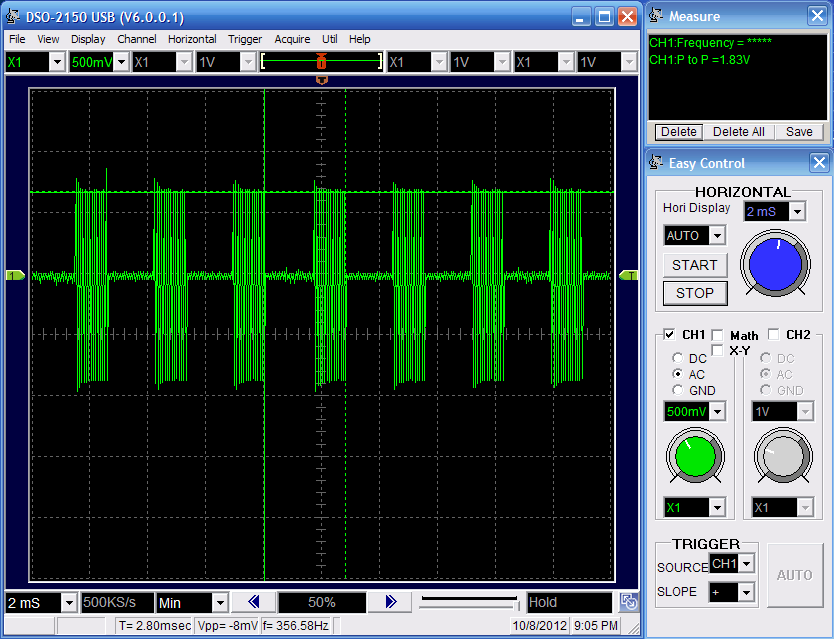 The output is either a gigantic sinwave with 2v peak-to-peak amplitude or basically 0v. The spacing between on/off transitions is in-line with our original 350 Hz signal. So now let's do some power measurements to see how 'powerful' our transmitter actually is!