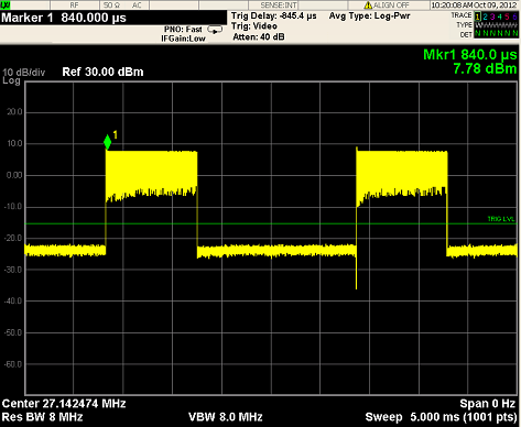 The power output wave seen above looks exactly like the square wave we wanted to transmit which is pretty cool given how we're still looking at a mixed signal. This means our receiver should have an easy time distinguishing between the on/off points that hit 7dBm and -25dBm. These transmission strenghts are well within the regualtions of most governments.