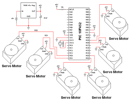 The electrical schematic for controlling the servo motors that we're using as acuators is surprisingly simple due to the fact that the servos are very self contained. The PIC will control them with a specific signal for each servo. The main devices used in the circuit are the Pico Servo or Sub-Micro Servos , 7805 and PIC 18F452.