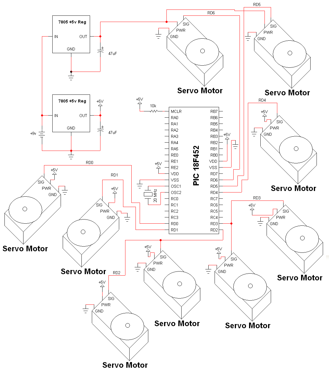 The electrical schematic for controlling the servo motors that we're using as acuators is surprisingly simple due to the fact that the servos are very self contained. The PIC will control them with a specific signal for each servo. The main devices used in the circuit are the HS-485HB, HS-645MG , 7805 and PIC 18F452.