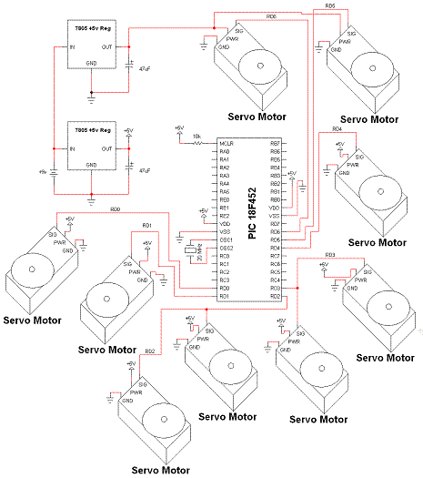 Two 7805 power regulation circuits are used to power all of the servos and the 18F452. The reason I use two of these circuits is simply because one 7805 would not be able to supply enough power when all of the servos are at full-load.