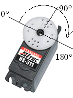 The other portion of the wave that we want to understand is the t part. This is the 'up' part of the wave, meaning a positive +5v is being given out. The rest of the 20mS period a 0v should be output. The variance of 0.9mS->2.1mS is what tells the servo to move & where. Most servos can rotate 90° or 180° and the ones I use can rotate 180°.