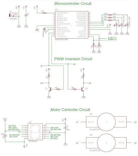 The schematic for controlling the motors is split up into three main parts, with each part having a unique functionality. The main parts used and seen in the schematic below are the 18F252, SN754410 and 2N2222 Transistors.