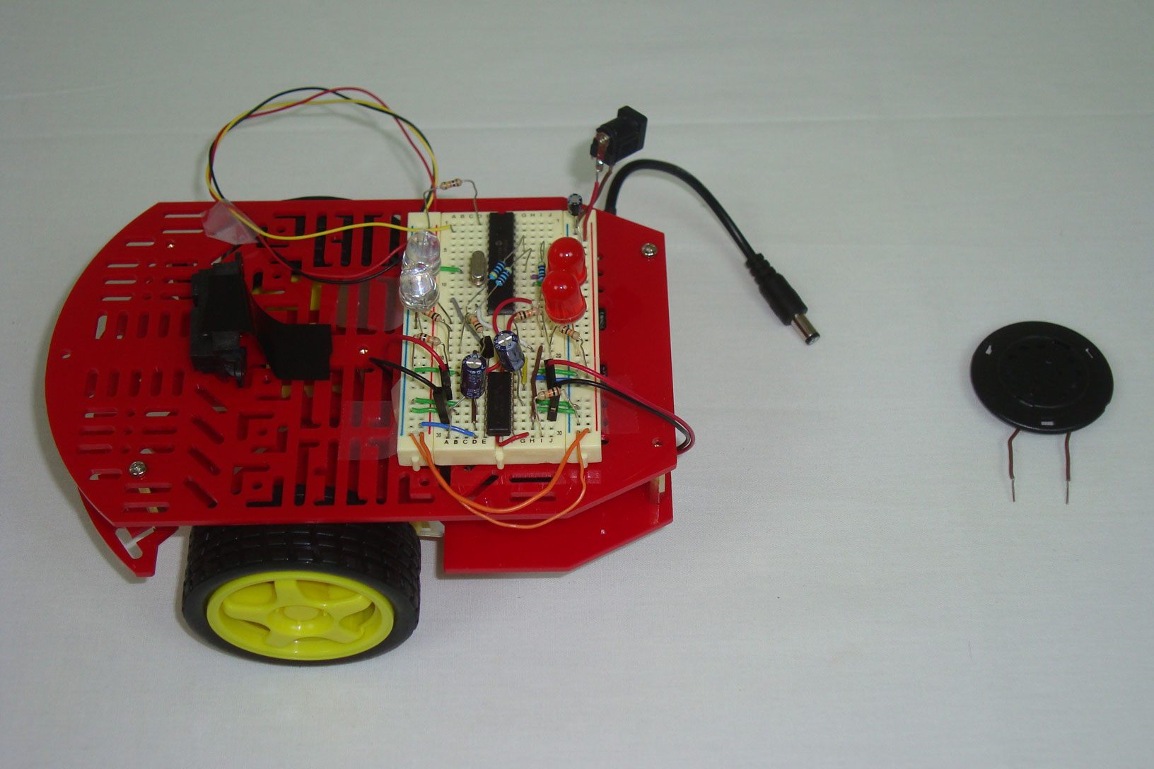 The focus of this article has been purely on the proximity sensor that we'll be adding to our robot. So finally, after all that learning, we are ready to add it to our project. Along with the proximity sensor, some LEDs, resistors and a speaker will be added to the breadboard circuit.