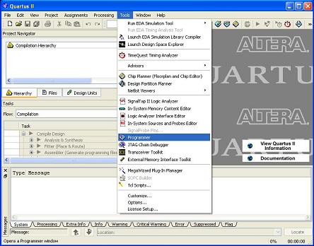 The software we'll use on the desktop/laptop end to program the FPGA is called Quartus II and it's made by Altera. We'll only be looking at the programming option inside of Quartus II which is located under Tools ~> Programmer. The picture below shows you where it is and what it looks like.