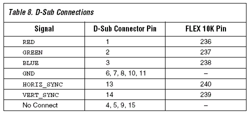 Aside from the simple overview schematic, we'll need to know the hardwired pins to the vga port. The table below show you which pins off the CPLD are hooked up to exactly which pin on the VGA port.