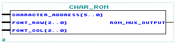 The character rom that we will build will be fairly small in terms of memory required (around 4k). This will give us enough rom space for all the characters in the alphabet and some special characters. As seen in the sample entity above, each rom character will have an address location inside the rom for when it needs to be called.