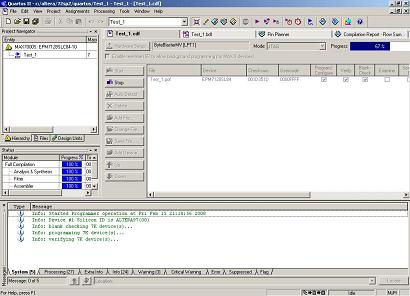 Programming the CPLD is a piece of cake. First double check the assignments->pins to make sure that the output pins are the ones they should be (between 61-70). Then go ahead and highlight the file in the programmer window, check Program/Configure & click start. It will program the device and you'll see the status in the status window.