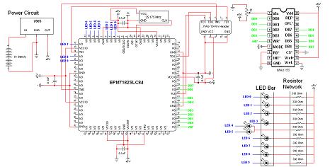 The schematic for this project is meant to be as simple as possible. We will be using the same CPLD setup from the standard CPLD Dev Board with a few additions. In addition to the EPM7128 CPLD, a new MAX150, 330Ω Resistor Network and LED Bar will be added.