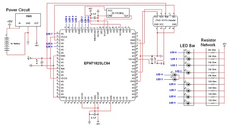 From the basic CPLD Dev Board we will made two new additions. First a resistor network of 330Ω will be added and pulled up to +5v. Second, the 10 LED bar will be added, connected to the resistor network and also connected to the FPGA.