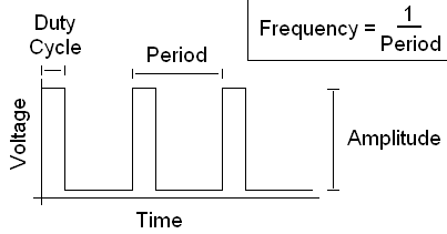 The type of PWM signal we'll be generating will ultimately look like the pictures above. We'll be shooting for a 60-120 Hz frequency range, with an amplitude of +5v (because our system uses +5v). The duty cycle, however, will vary between 0% (fully-off state) and 100% (fully-on state).