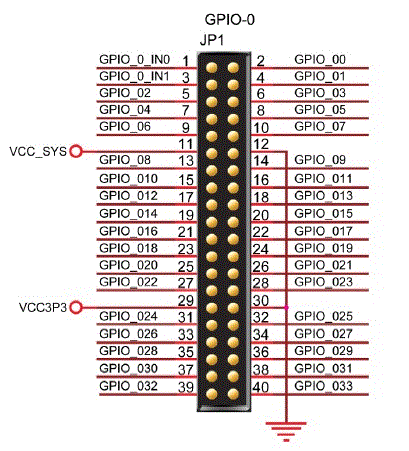 The DE0 Nano's expansion port has 40 pins. 34 pins are outputs, 4 pins are input, 2 ground connections, 1 System VCC and 1 3.3V VCC. The picture below shows you what pin has what functionality so that when we connect the expansion port to a breadboard, we can properly map pin-to-pin.