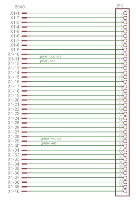 The schematic for breakout boards is thankfully simple. It's usually connector to connector which is two circuit symbols and a bunch of wires. It's important to note that 4 lines are actually very special. There are two power connections and two ground connections. You don't want to short these together, so I marked them on the schematic.