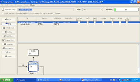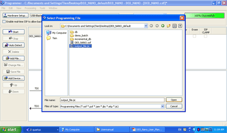 ·After you have the output_file.jic, open the Altera programmer (Tools->Programmer) and add the output_file.jic file to the file list:
