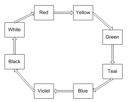 Once the VGA timing has been worked out, the color pattern generator will be built to display 8 colors. The sequence of the colors can be seen above. These colors are created by changing the various Red, Green, Blue VGA color pins, mixing and matching to the appropriate color. Take a look at a color wheel if you've forgotten what colors mix together to form new colors (i.e. Red + Green = Yellow).