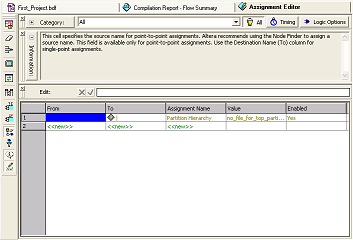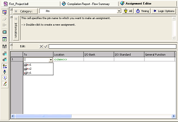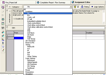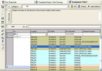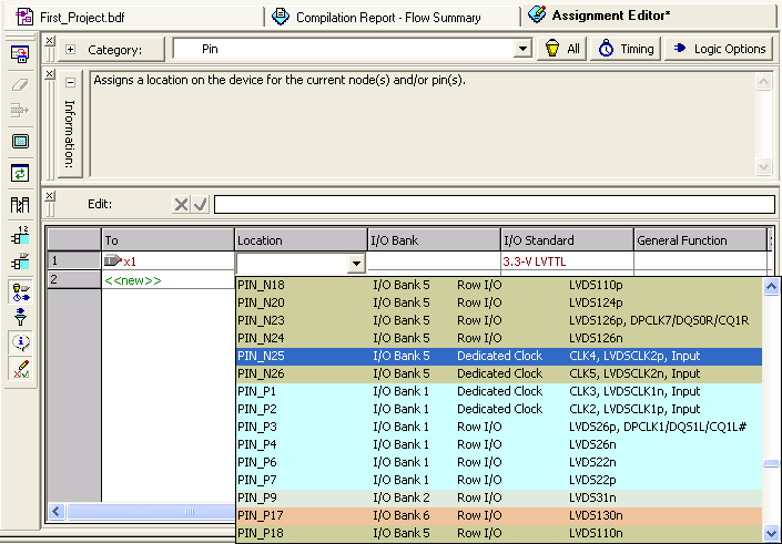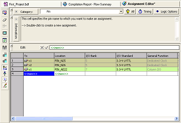 We want to assign the two input pins to two of the switches on the DE2 board. If we look at the DE2 board schematic we have 18 switches to choose from and even more LEDS for output. For ease lets use switches 0 & 1 and led 0. These are located on the FPGA at pins N26, N25 & AE22 respectively.
