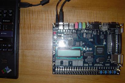 So now let's proceed, don't worry it's easy! Plug in the USB ByteBlaster to your computer and to the DE2 board. Make sure that the power to the board is also plugged in. That should all look something like this: