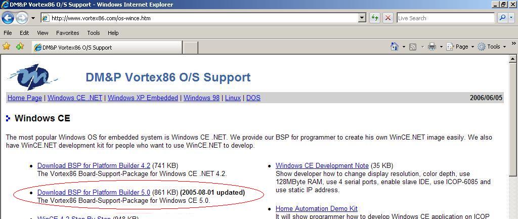 Luckily, ICOP (maker of the eBOX) & Vortex offer BSP's for download for WinCE 4.1 & 5.0 on their website. So just go yahoo or google: vortex86 o/s support. The first result will be download page on vortex's website. Click the link Download BSP for Platform Builder 5.0 to download the BSP. Here's an image of the site: