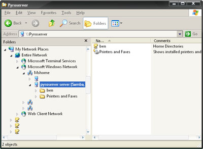ben@pyroserver:~$ sudo /etc/init.d/samba restartAnd now we're done on the file server machine! Feel free to disconnect the monitor, keyboard, and mouse because we won't need them any more (you must change a setting in the BIOS to allow your machine to boot up without a keyboard if you ever want to reboot the machine -- but since it's Linux, why would we ever need to reboot?). You can use an SSH client on the host machine to connect to the server from now on. I use PuTTY myself and would advise others to use it.