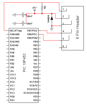 One important note I'd like to add before looking at the entire schematic is that this circuit will not work in its current form. We need to combine the power circuit & the programming circuit before we'll be able to program the PIC.