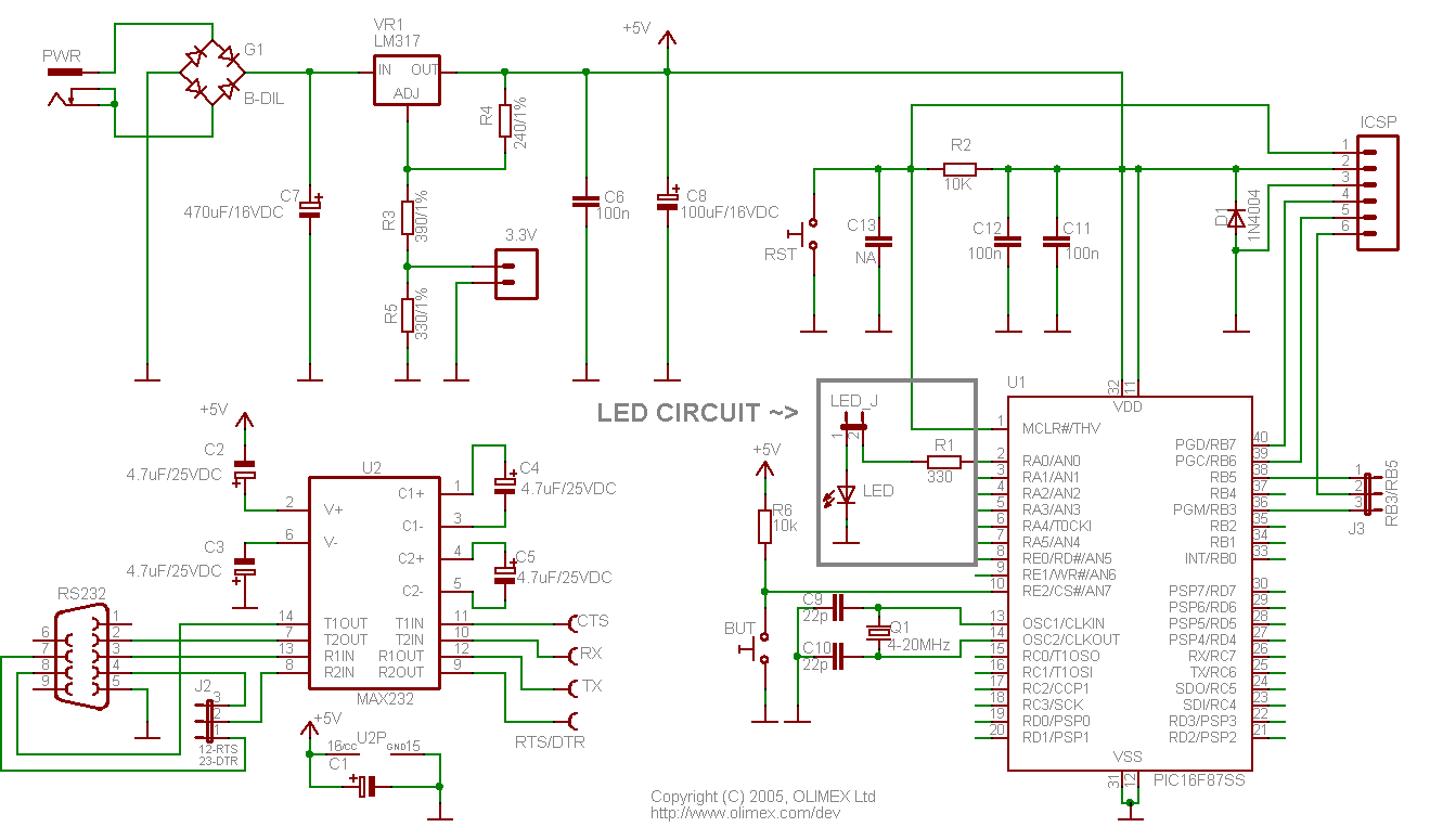 Below is the schematic of the Development Board used in this tutorial. I altered it a little to draw attention to where the LED is connected. Notice it is connected to Bit 0 of PORTA, aka RA0.