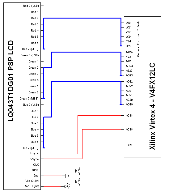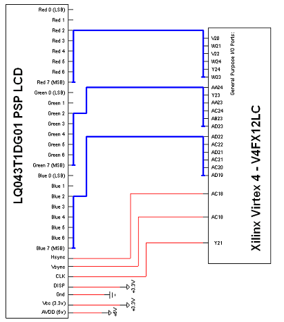 The schematic for this tutorial is for the most part straight connections from the FPGA to the PSP LCD with the exception of a few power signals coming from the power supply board.