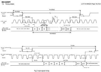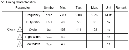 The clock signal seen in the first timing diagram above needs to adhere to the frequency timing characteristics table. Specifically the first two rows: Frequency and Duty Ratio. Ideally the clock input to the PSP LCD should be 9 MHz, but it can range from 7.83 -> 9.26 MHz. This is a great advantage for us because the wide frequency range means even if we can't hit a clock rate of 9 MHz on the date, the display will still work.