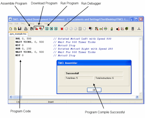 If you plan to connect your TMCM-1110 through the USB interface, you'll need to grab the TMCM-1110.inf as well so windows knows how to communicate with the board. Once you open the IDE, it is actualy super simple. A few buttons are used for assembling the program, downloading it and running it. Here is an example program with some comments: