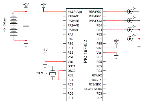 There is really nothing special happening here. Power (+5v) and Ground are all wired respectively. The MCLR/Vdd pin will always be tied high so that the PIC never resets.