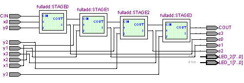 In the main vhdl program that puts everything together 4 stages are used, each stage uses a 1-bit adder port. The main vhdl program combines these to create The 4-bit adder. The architecture of the PORT can be seen just following the main Project_1 entity: