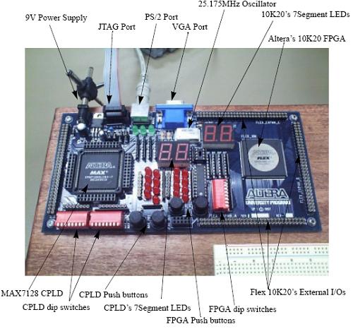 On the same topic; the manual for this board is oddly enough quite thourough. You can get the PDF off of altera's website or if you bought the board it comes with it. The pinouts for the VGA/PS2/7 Segments & everything are listed nicely in tables through the manual.