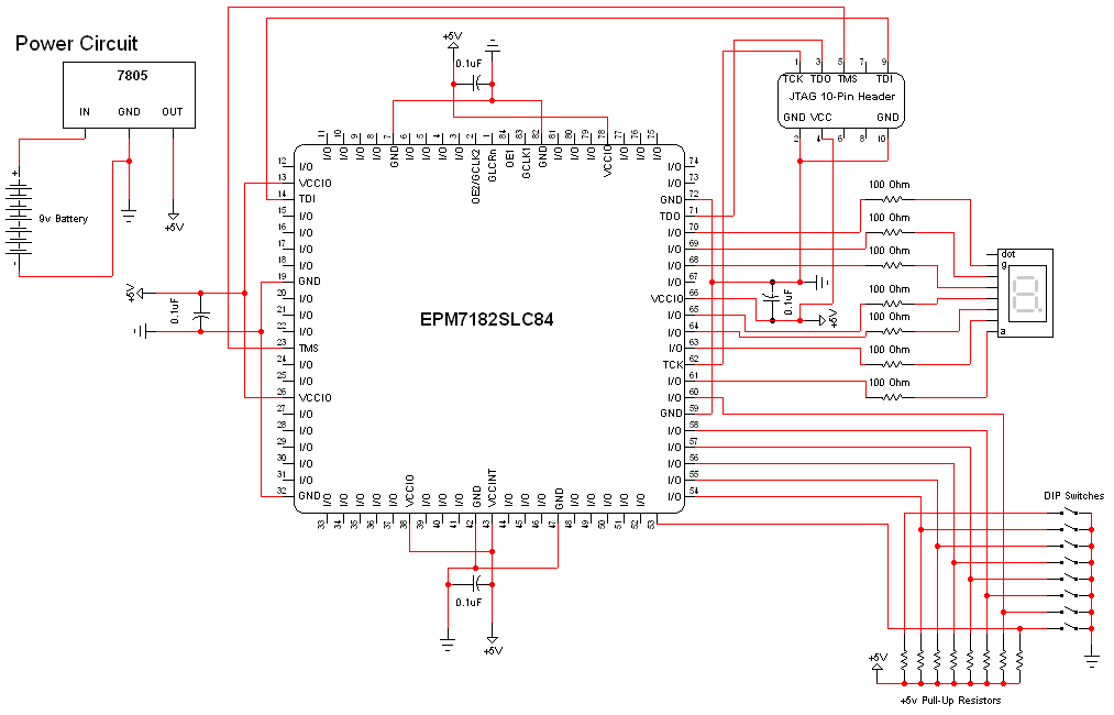 The 7 segment led display is wired up to 7 pins between 61-70 on the CPLD. These 7 pins control which leds are lit up inside the display. For our purposes in this project we'll only make a simple program that lights them all up, nothing too fancy. The 100 resistors that precede the display are just current limiting resistors.