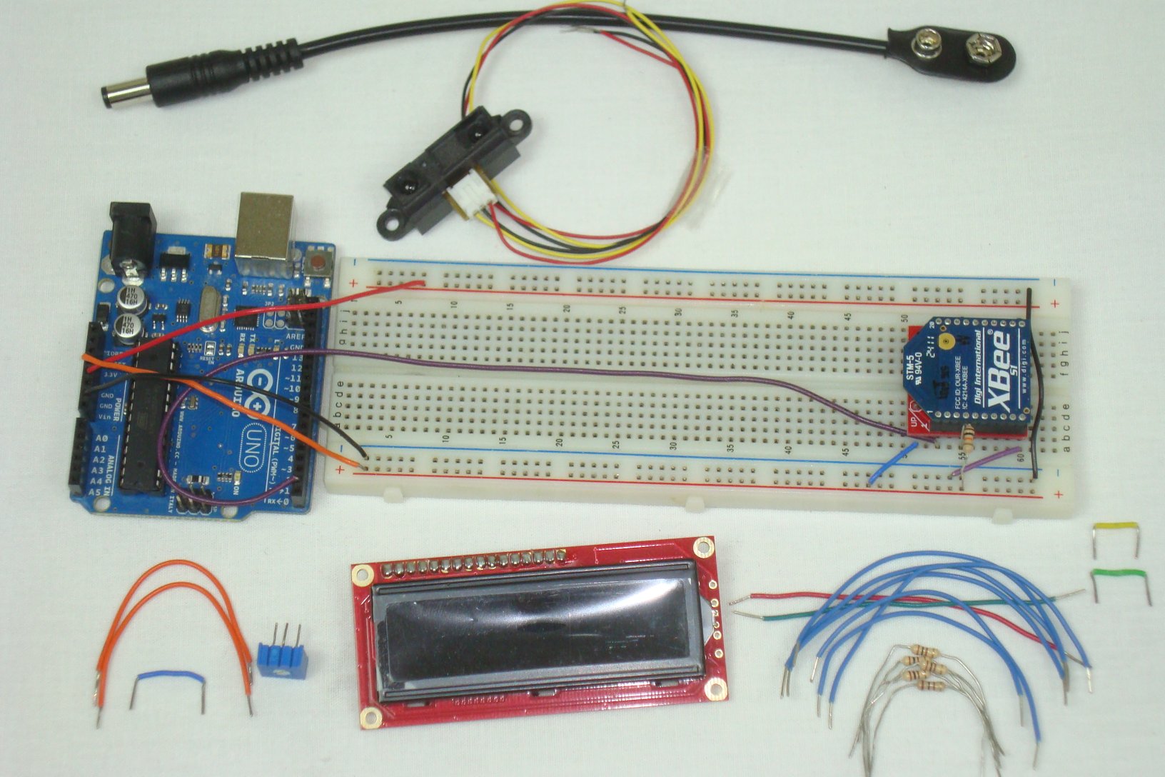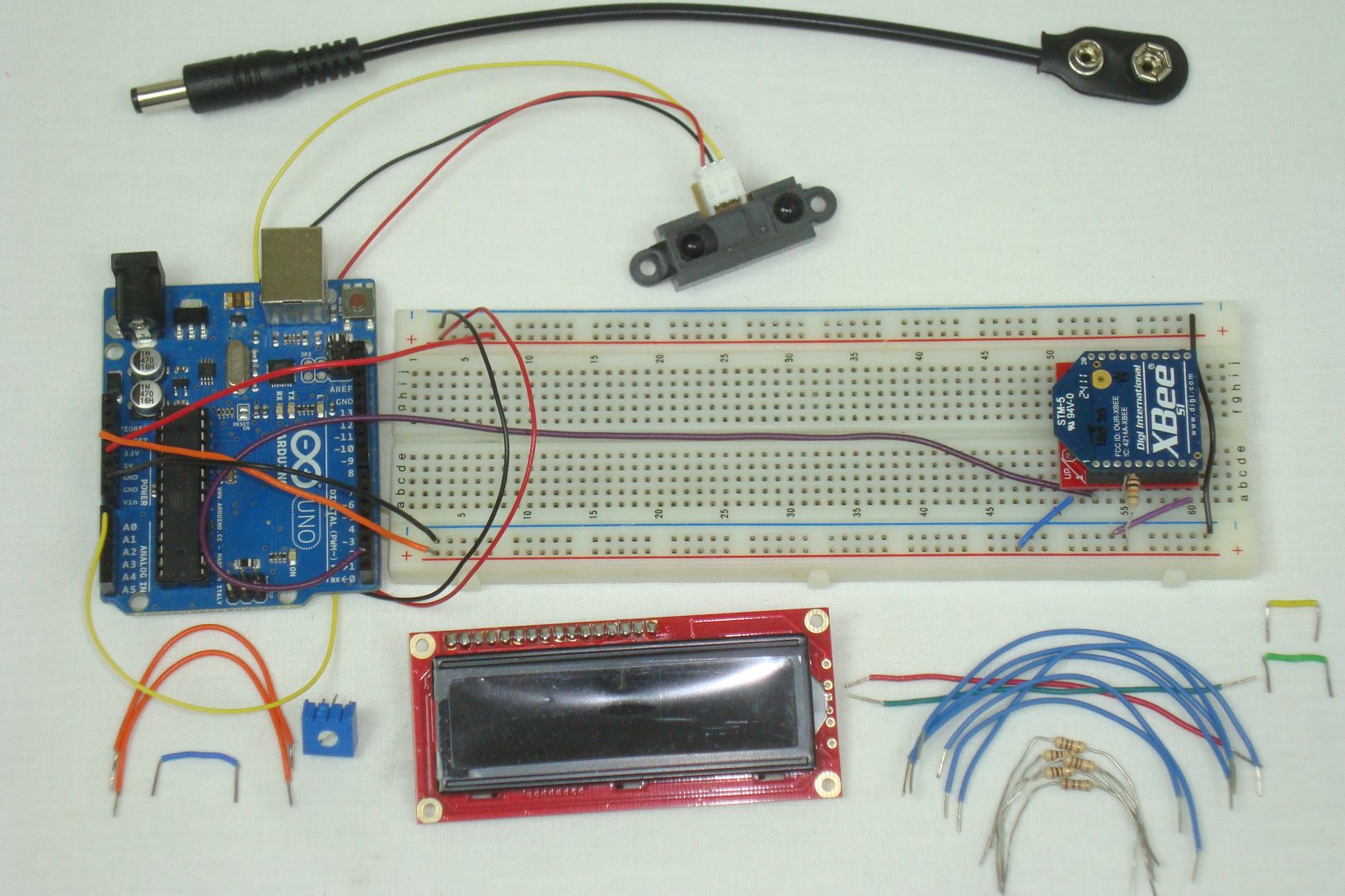 The first connections are connecting the +5v power to one side of the breadboard, +3.3v to the other side and also ground. Then the XBee module was connected to the +3.3v power, ground and to the Arduino's Rx digital pin 0.