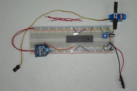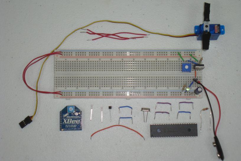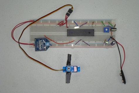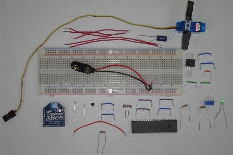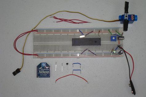 The second part of the hardware we need to put together is the receiver portion of the schematic. This hardware will receive the wireless transmission, decode and tell the servo motor where and how to move.